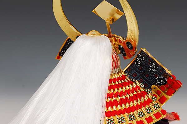 白熊と呼ばれる白い毛が頭の上に付いている兜です。